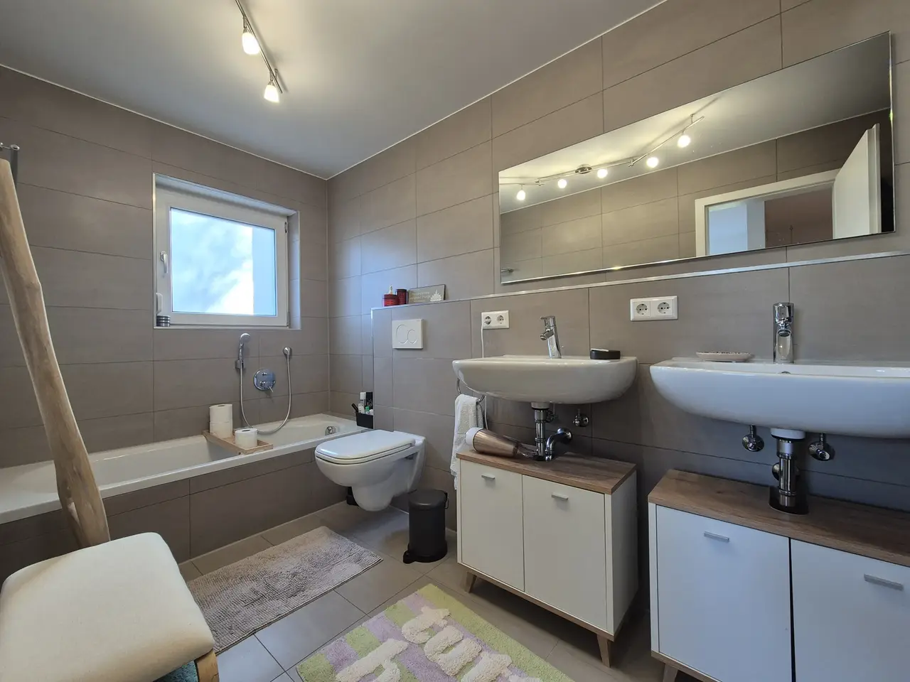 Das sehr elegantes Badezimmer verfügt über eine Dusche, eine Badewanne und 2 Waschbecken, ein praktisches Gäste-WC ist ebenfalls vorhanden.