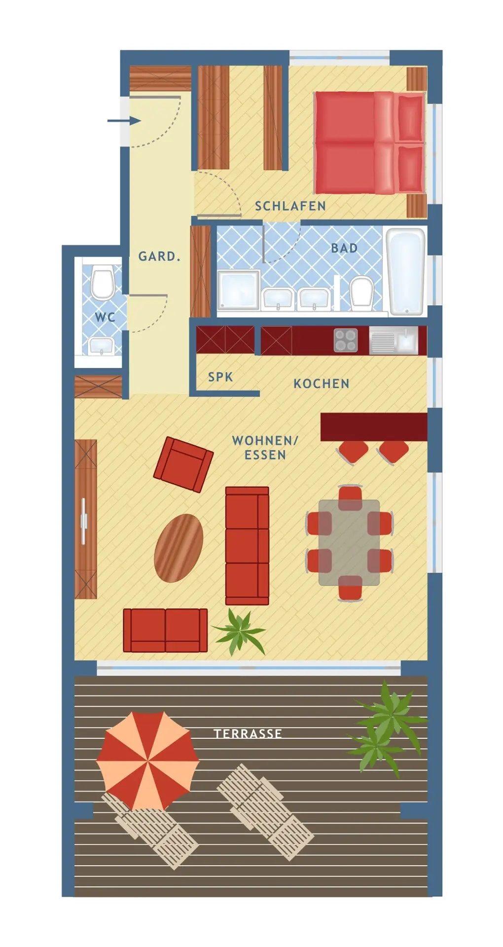 Die Ausstattung ist insgesamt sehr gehoben und ansprechend. Ein Highlight ist die einladende Terrasse, die ideale Bedingungen für entspannte Stunden an der frischen Luft bietet.
