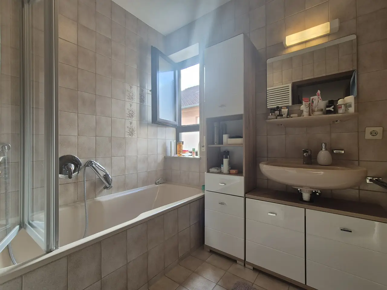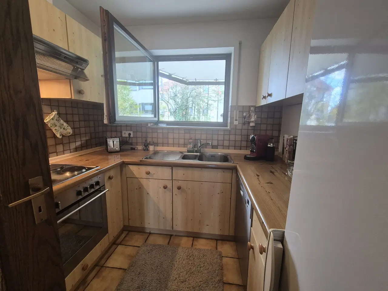 Die Einbauküche ist in hellem Holz gehalten und funktional ausgestattet mit Elektrogeräten inkl. einer Spülmaschine. Die Wohnung verfügt über ein modernes Tageslichtbad mit Wanne und Waschbecken, das funktional und stilvoll gestaltet ist. Das WC ist separat.
