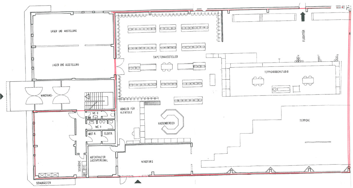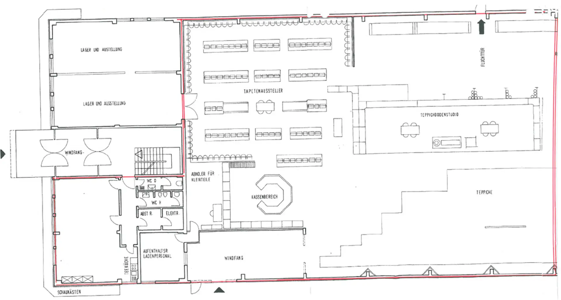 Die Räumlichkeiten verteilen sich auf mehrere großzügige Ausstellungsflächen, Büros, Besprechungsräume und einen Empfangsbereich. Die Flächen können nach Rücksprache ggf. noch angepasst werden.